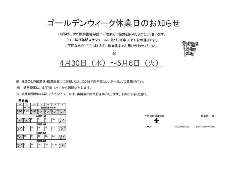 日頃より、ナビ個別指導学院にご理解とご協力を賜りありがとうございます。さて、弊社年間スケジュールに基づく休業日は下記の通りです。