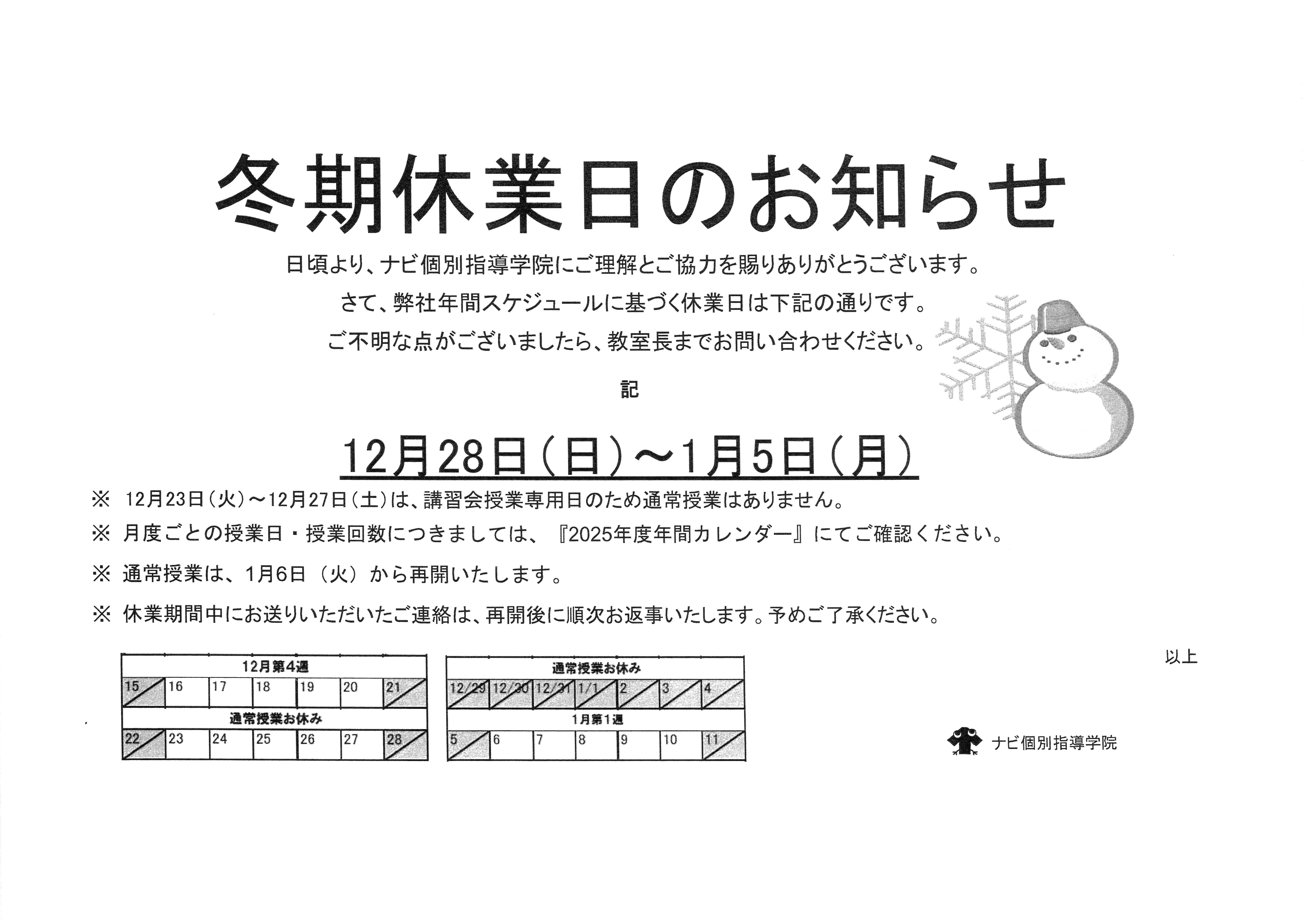 冬期休業日 12月28日(日)から1月5日(月)