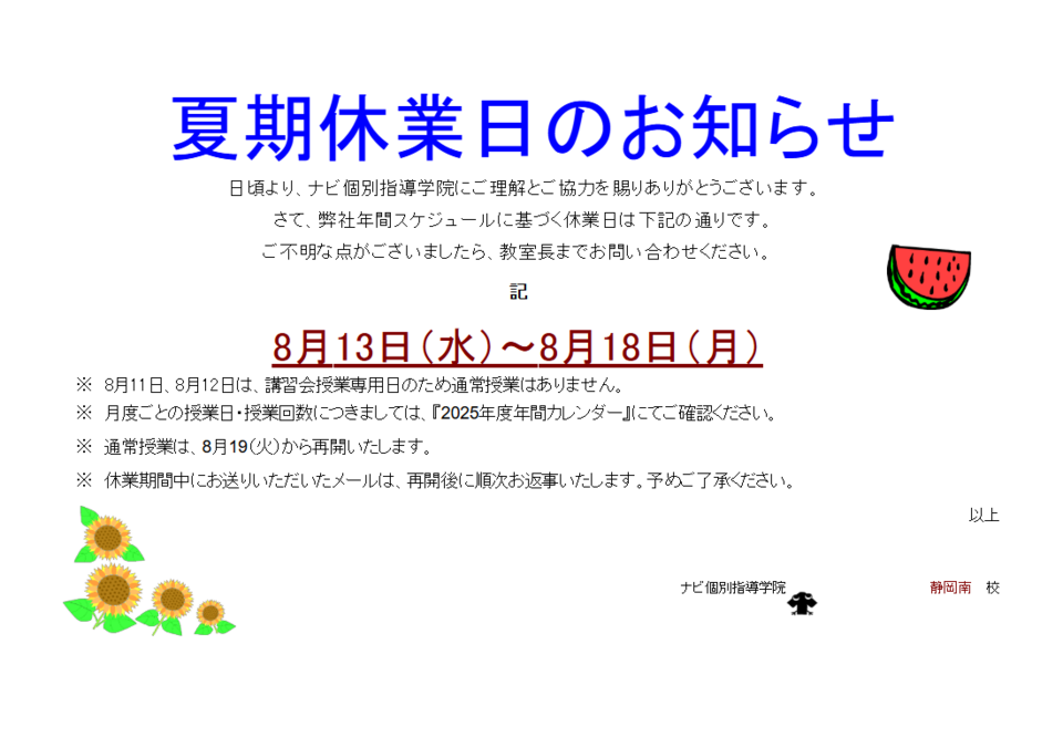8/11(月)・12(火)は講習会専用日となり、通常授業(振替を除く)はありません。