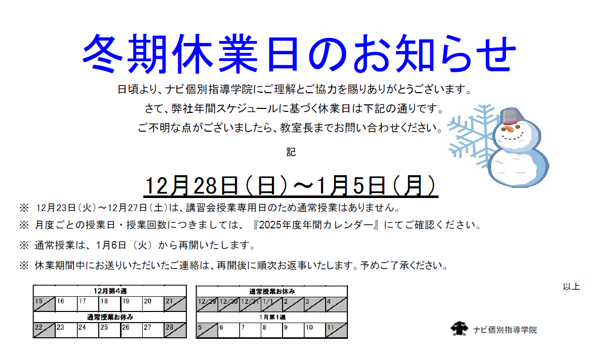 冬期休業日のお知らせ