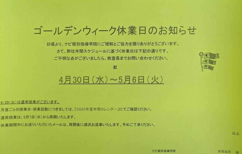 日頃より、ナビ個別指導学院にご理解とご協力を賜りありがとうございます。