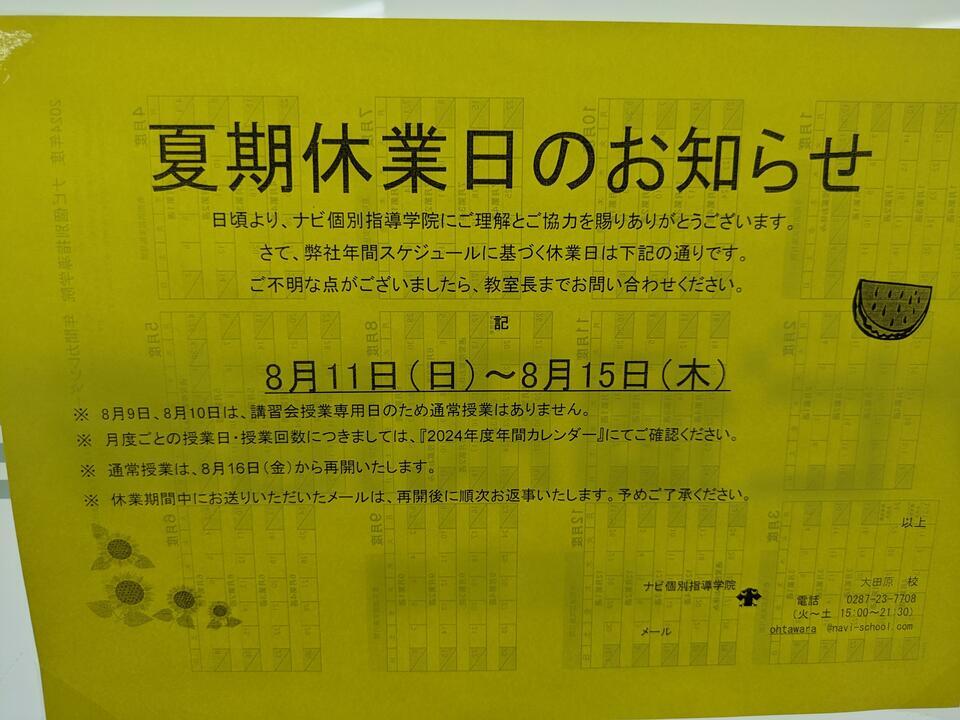 ※ 8月9日 (金)、8月10日 (土)は講習会授業専用日のため、通常授業はありません。