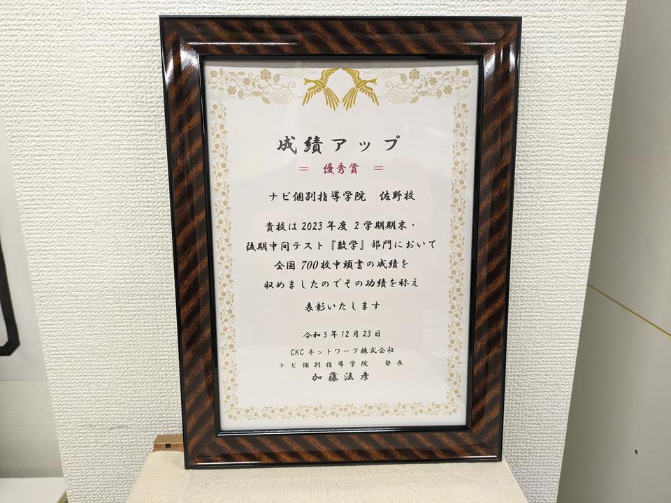 実は後期中間テストにおいて成績アップの優秀教室として表彰されました!!
