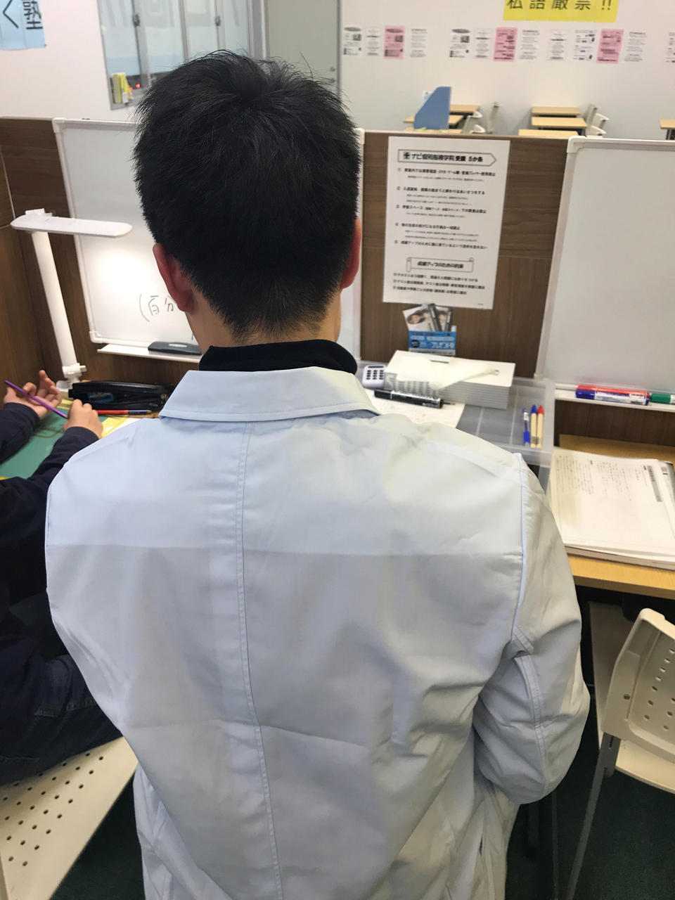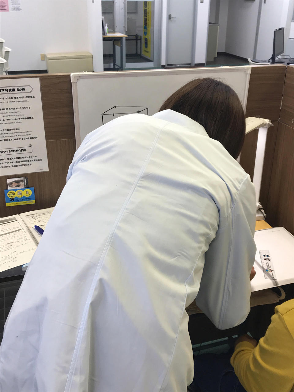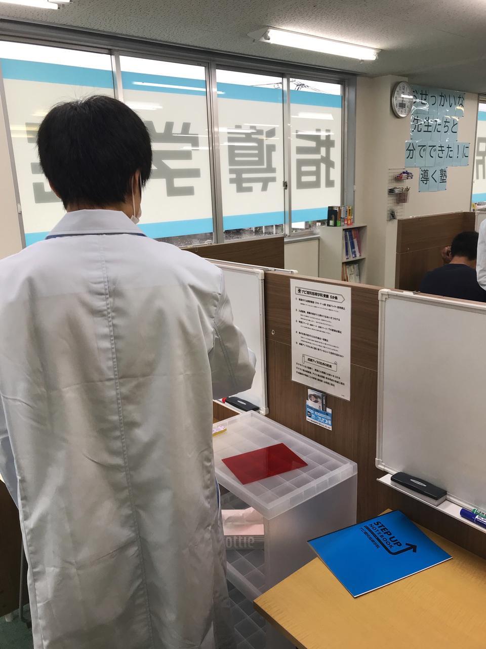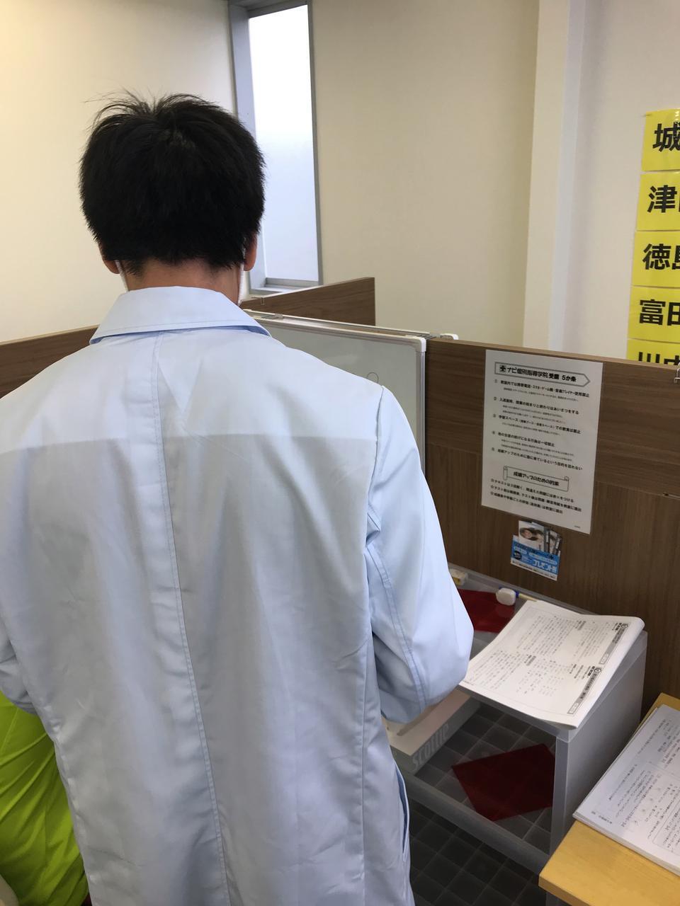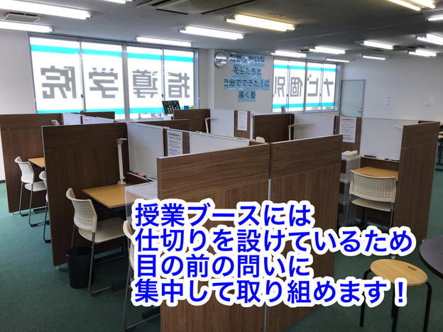 ナビ個別指導学院の授業は、個別の席ごとに設置された自分専用のホワイトボードで解き方や考え方を一緒に確認、それから生徒が問題を解くという「個別授業」スタイルです。