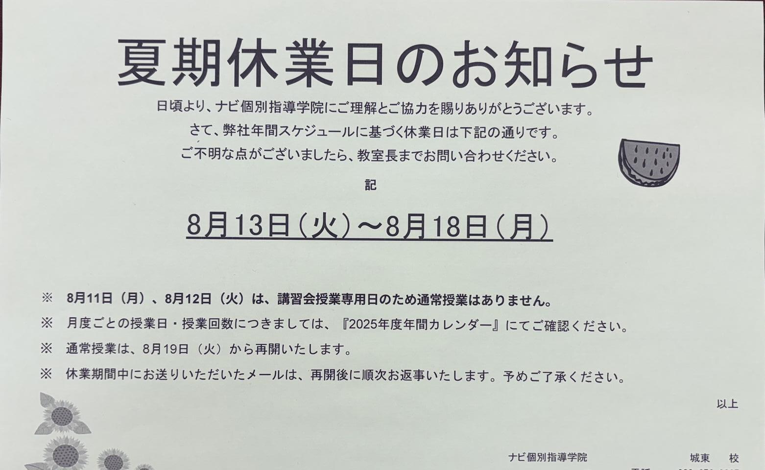 通常授業は10日(日)から18日(月)までお休みいたします。