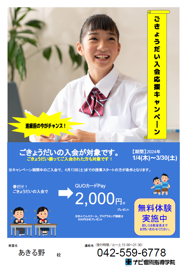 ナビ個別指導学院あきる野校では 1月4日(水)~3月31(金)まで ご兄弟入会応援キャンペーンを行っております。