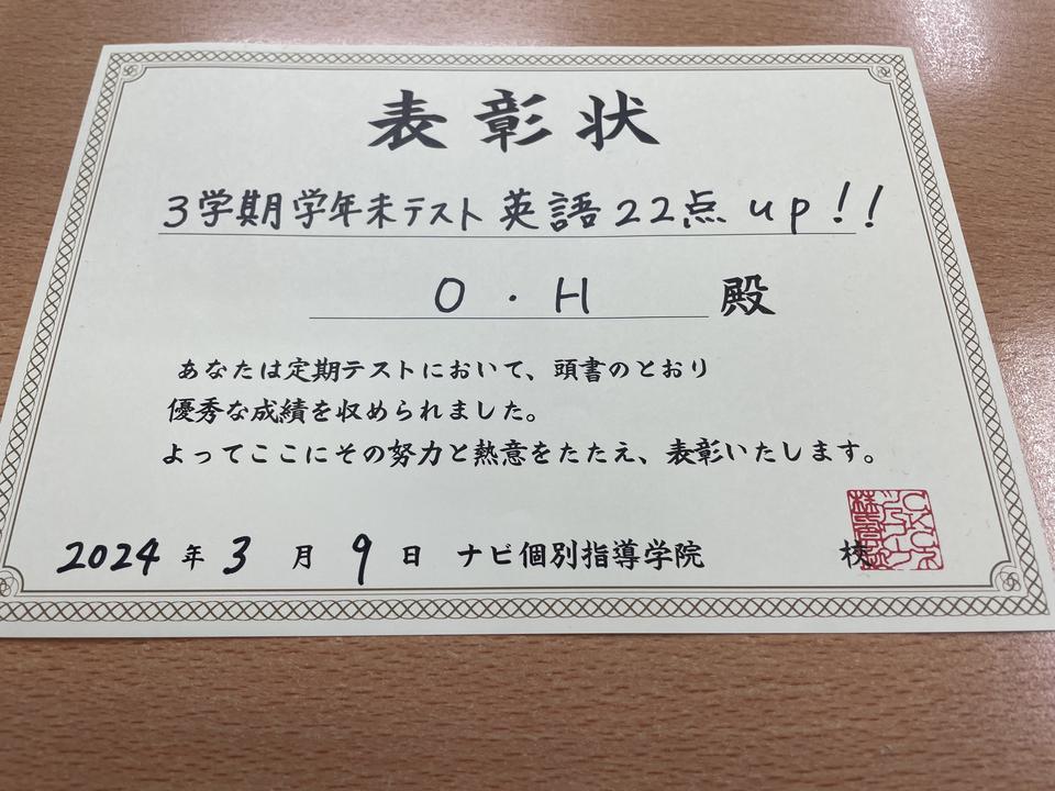 本日も前回に引き続き、学年末テストの成績アップした生徒をご紹介します!
