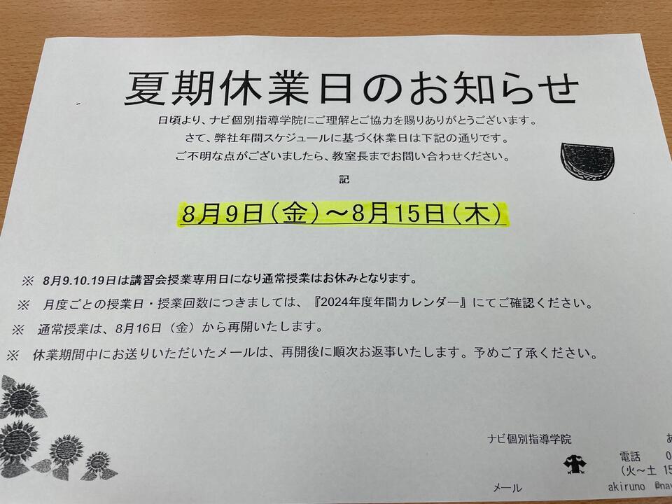 通常授業は8/16(金)から再開致しますので、休業期間中にお送り頂いたご連絡は再開後に順次お返事致します。