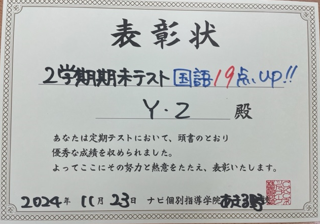 今回は中学3年生で国語19点アップしたY・Z君です!