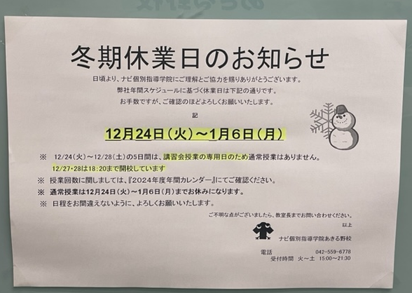12/24(火)~12/28(土)は講習会専用日のため通常授業はございません。