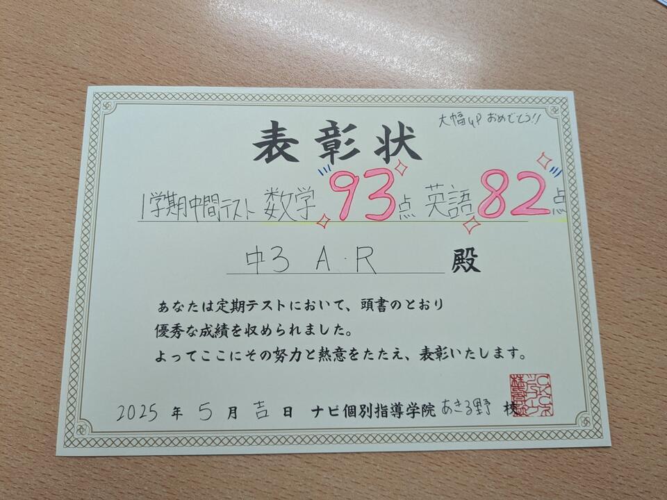 数学が93点、英語が82点 2教科とも前回から+20点以上できました!