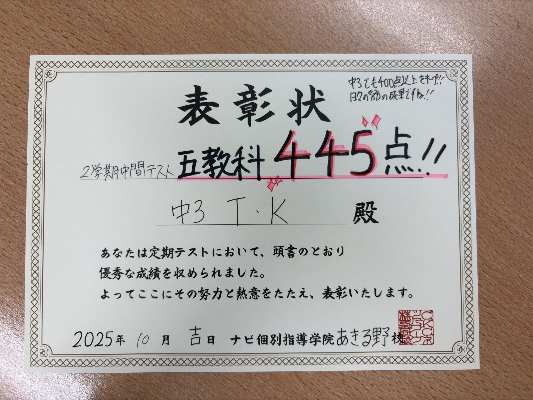5教科の合計得点 445点 !!
