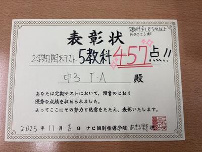 今回より2学期期末テストの優秀成績者をご紹介いたします。