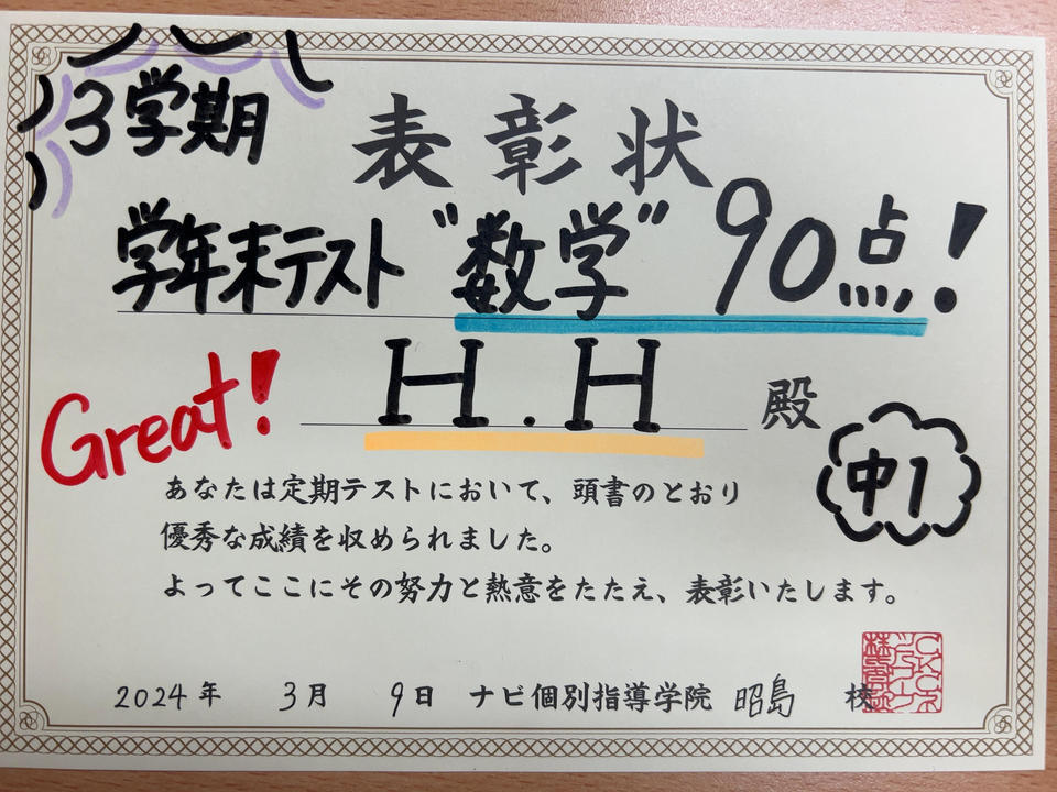 今回は3学期学年末テストの成績優秀者発表です!