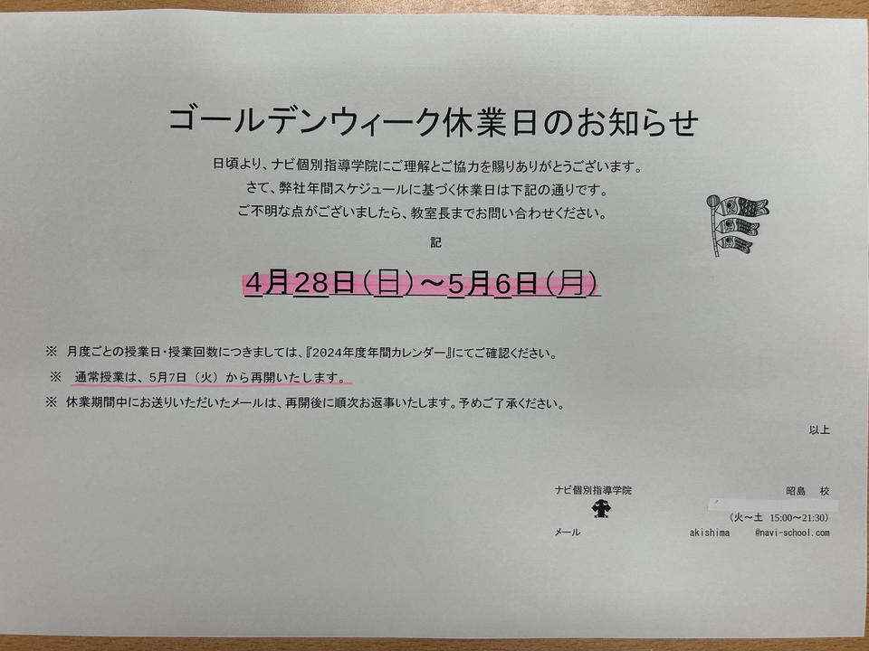 4/28(日)から5/6(月)は教室がお休みになります。