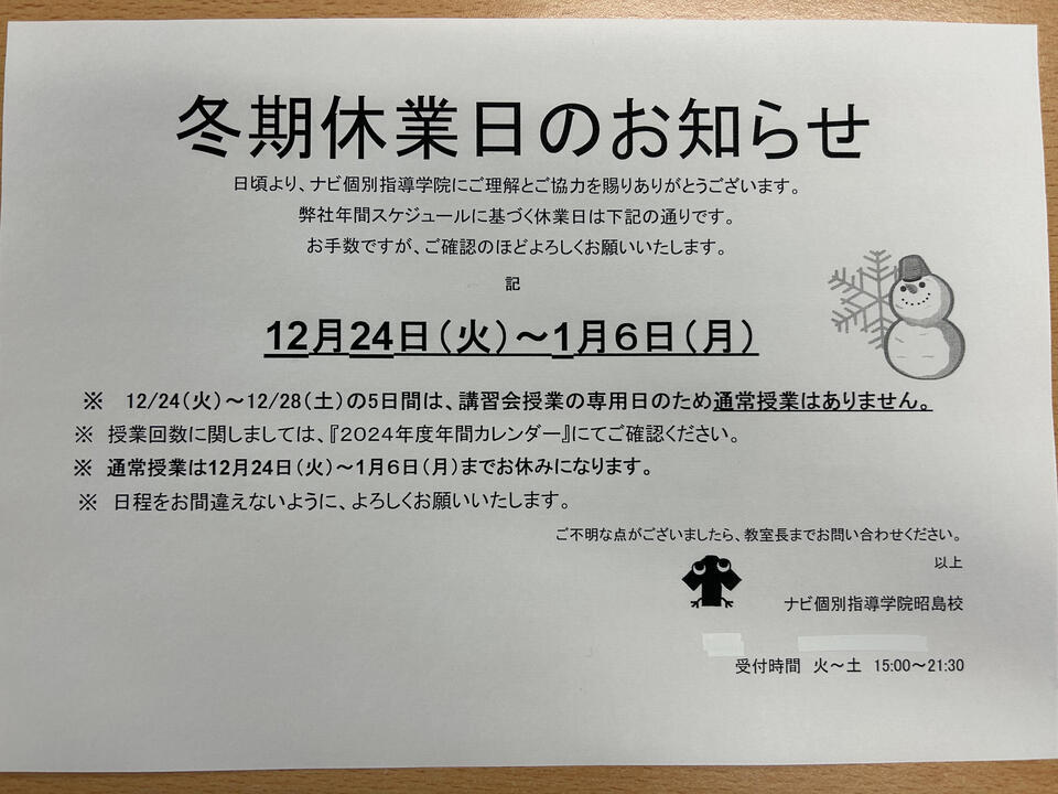 当塾では、12月24日(火)~1月6日(月)まで、冬期休業をいただきます。