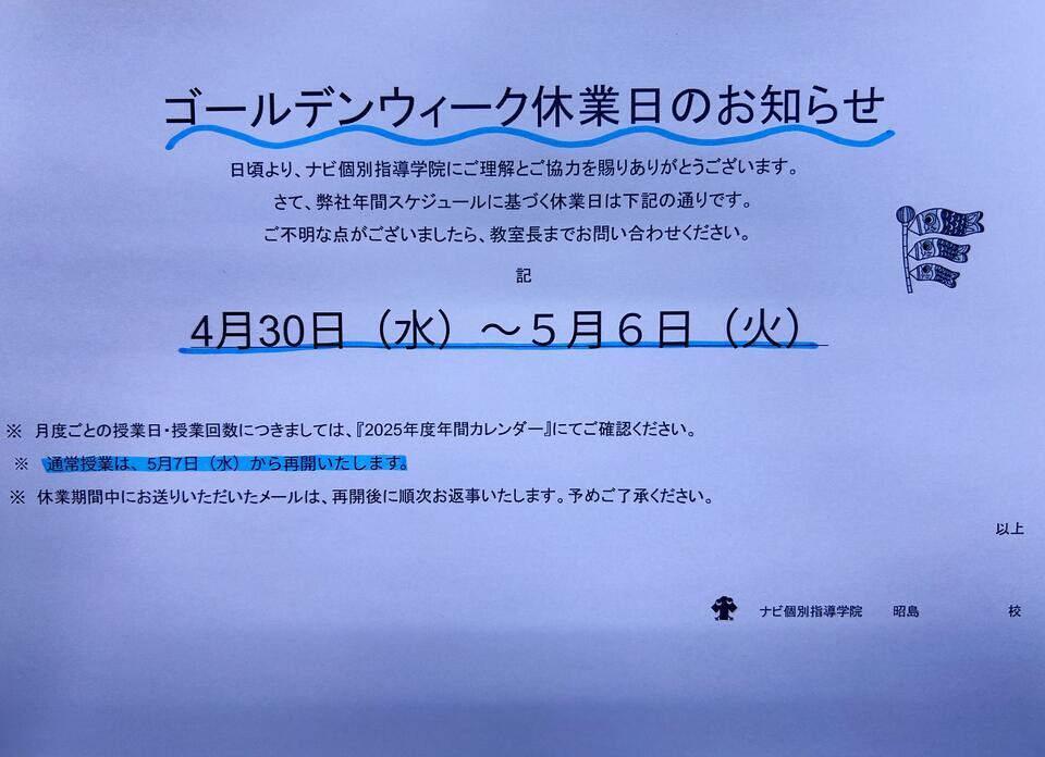4/30(水)~5/6(火)はゴールデンウイーク休業期間になりますので、
