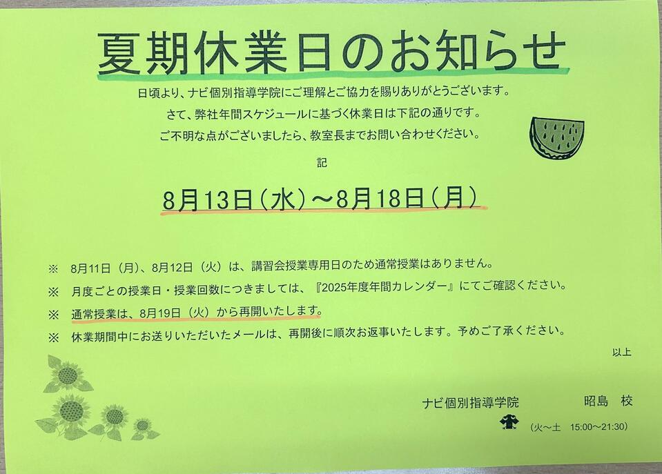 ナビ個別昭島校は、8/13~8/18が夏期休業期間