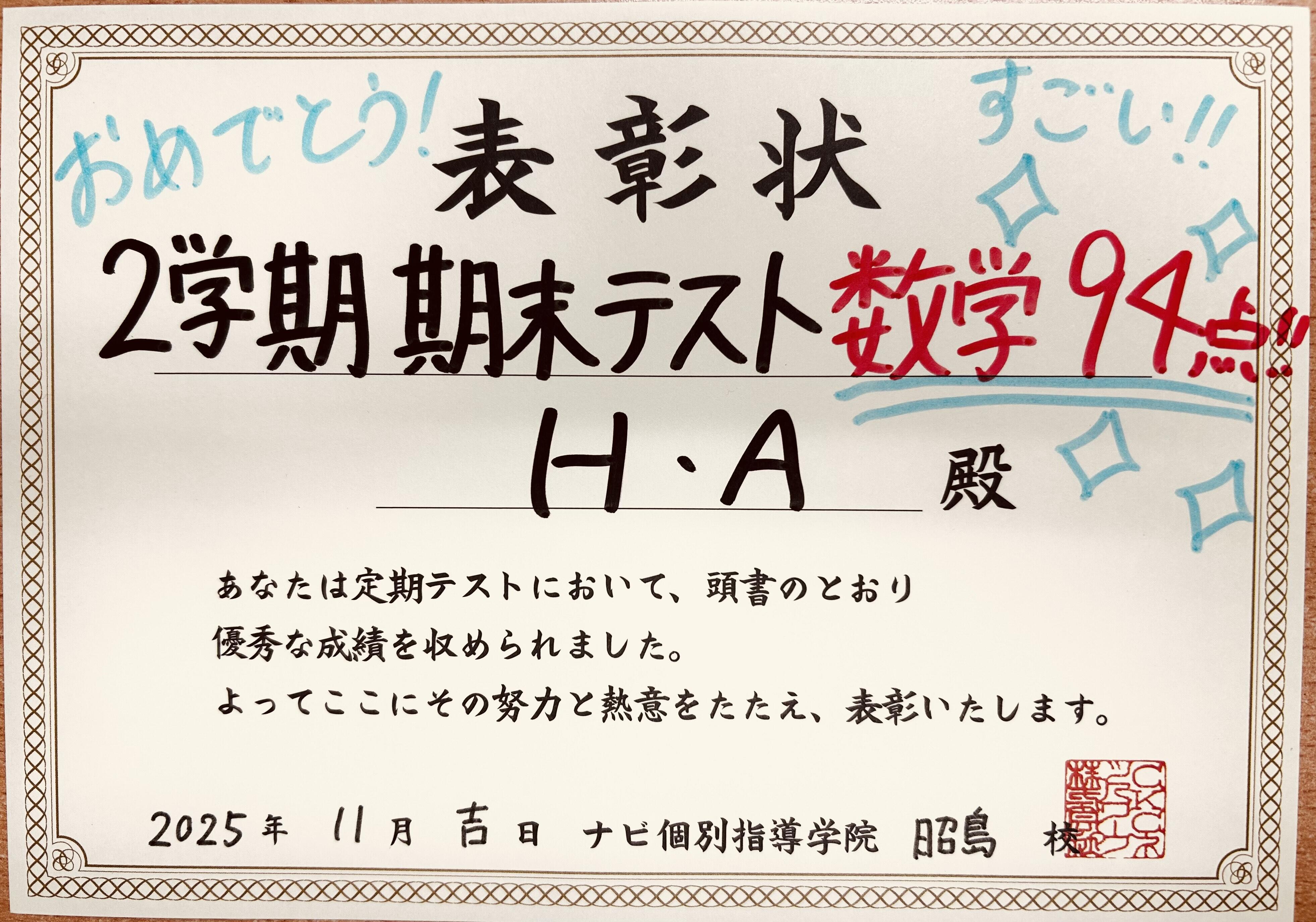 H・Aさんは数学で初めて90点を超えて、94点を取ることが出来ました!!