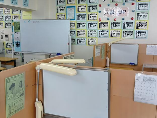 ナビ個別指導学院の授業は、個別の席ごとに設置された自分専用のホワイトボードで解き方や考え方を一緒に確認、それから生徒が問題を解くという「個別授業」スタイルです。