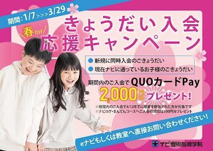 1月7日~3月29日までにご入会いただいた場合、一世帯に2,000円分のQUOカードPayをプレゼントします。