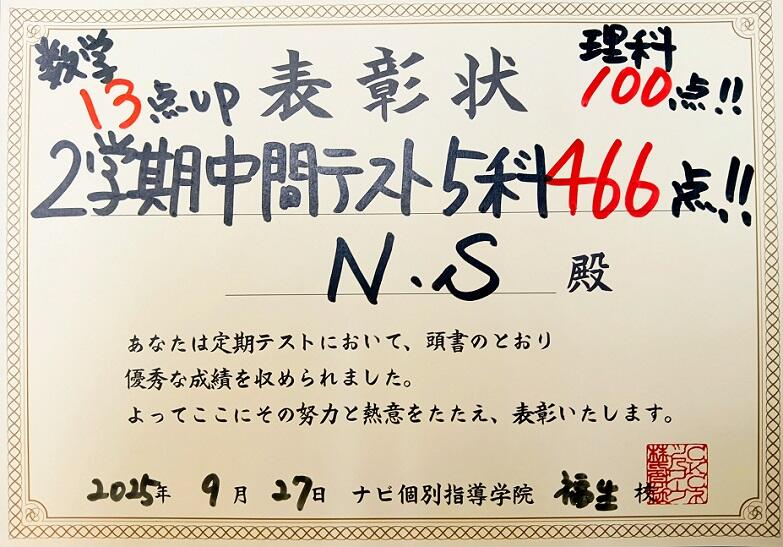 中1のNさん。8月に入塾し中間テストまで1ヶ月と