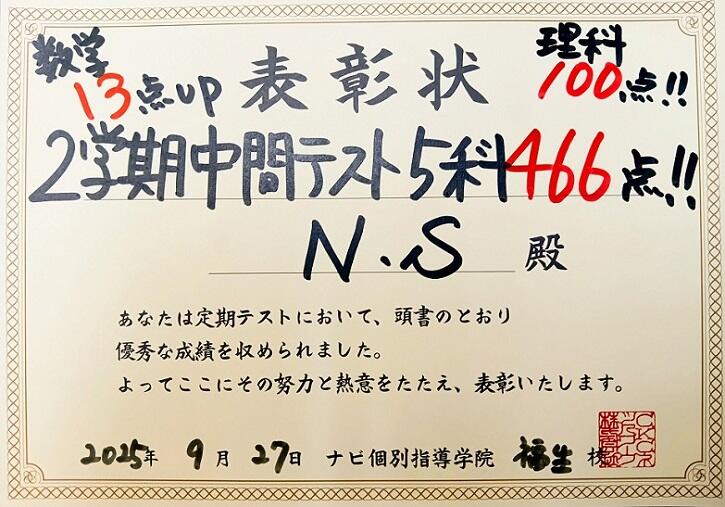 中1のNさん。8月に入塾し、中間テストまで1ヶ月と