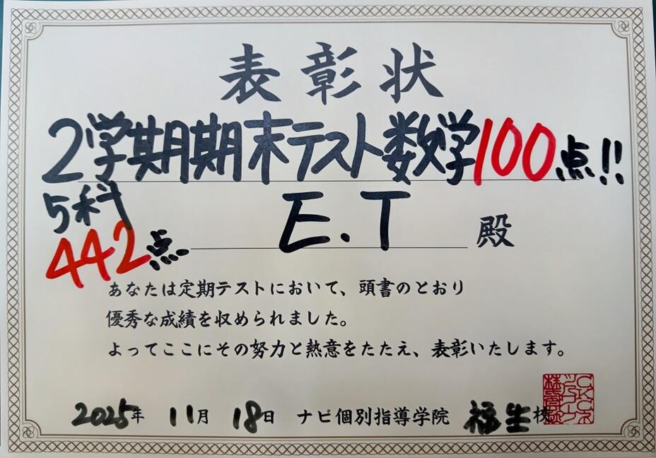 中2のEくん、数学100点!5科合計442点!
