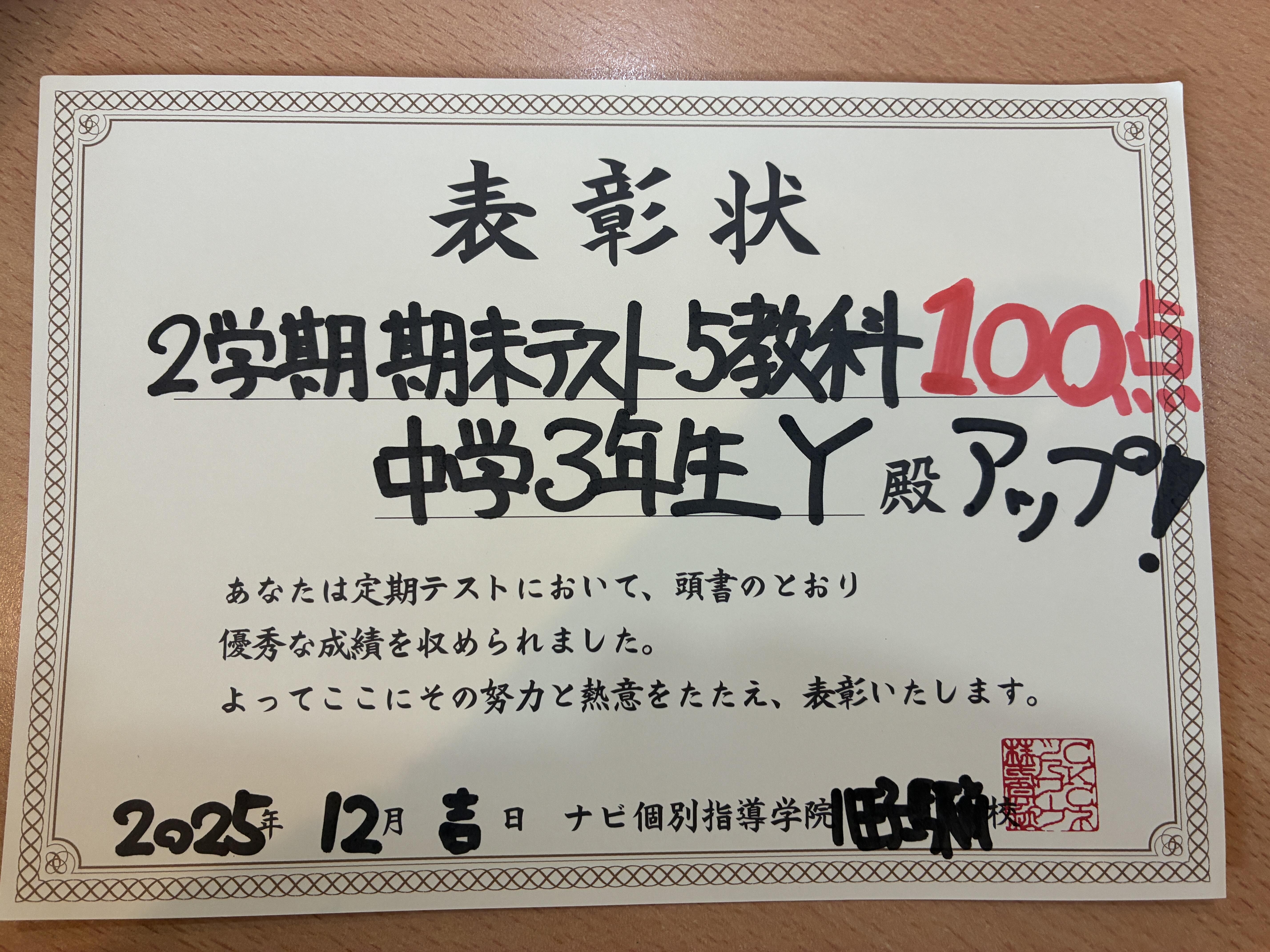 中学校3年生Yくん、5教科合計100点アップしてくれました!!