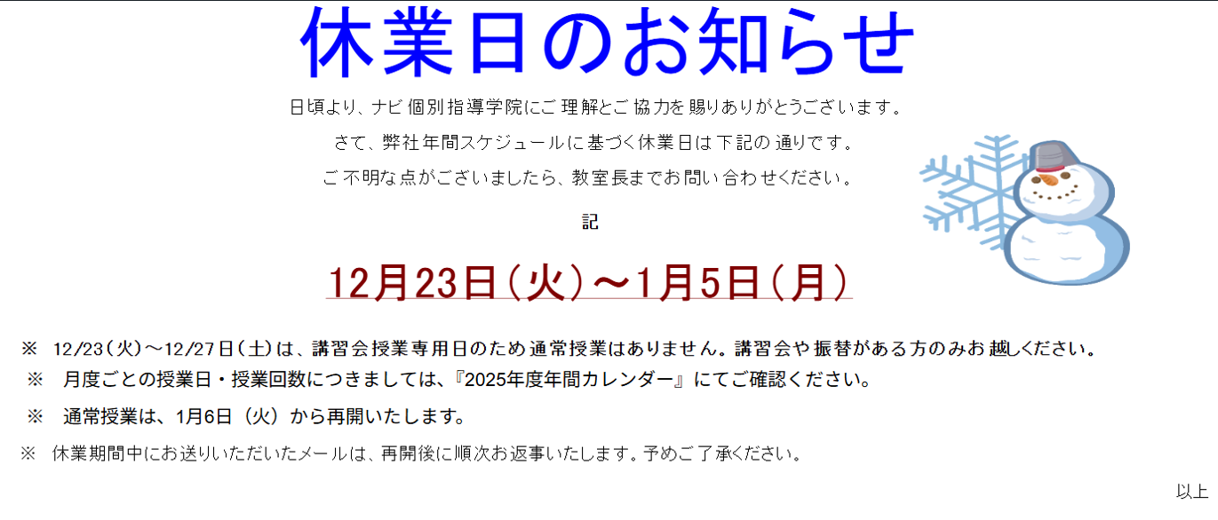 ※12/23(火)~12/27(土)についてはご案内済みのCKCテスト、合宿、講習会授業のみ開講しております。