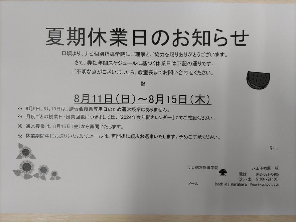 ナビ個別指導学院八王子楢原校は夏期休業日となります。