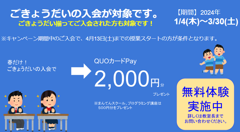 QUOカードPay2,000円分プレゼントします。(まんてんスクールは500円分)