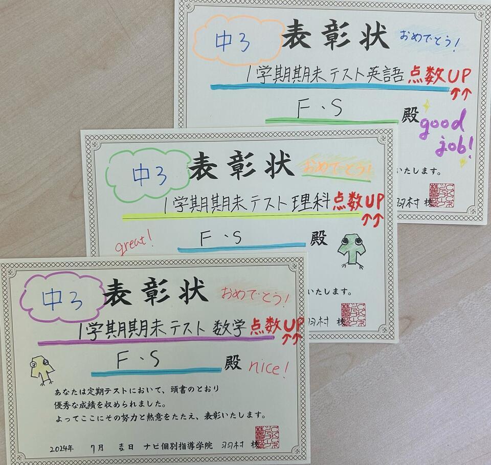 数学・英語・理科点数アップおめでとうございます!!