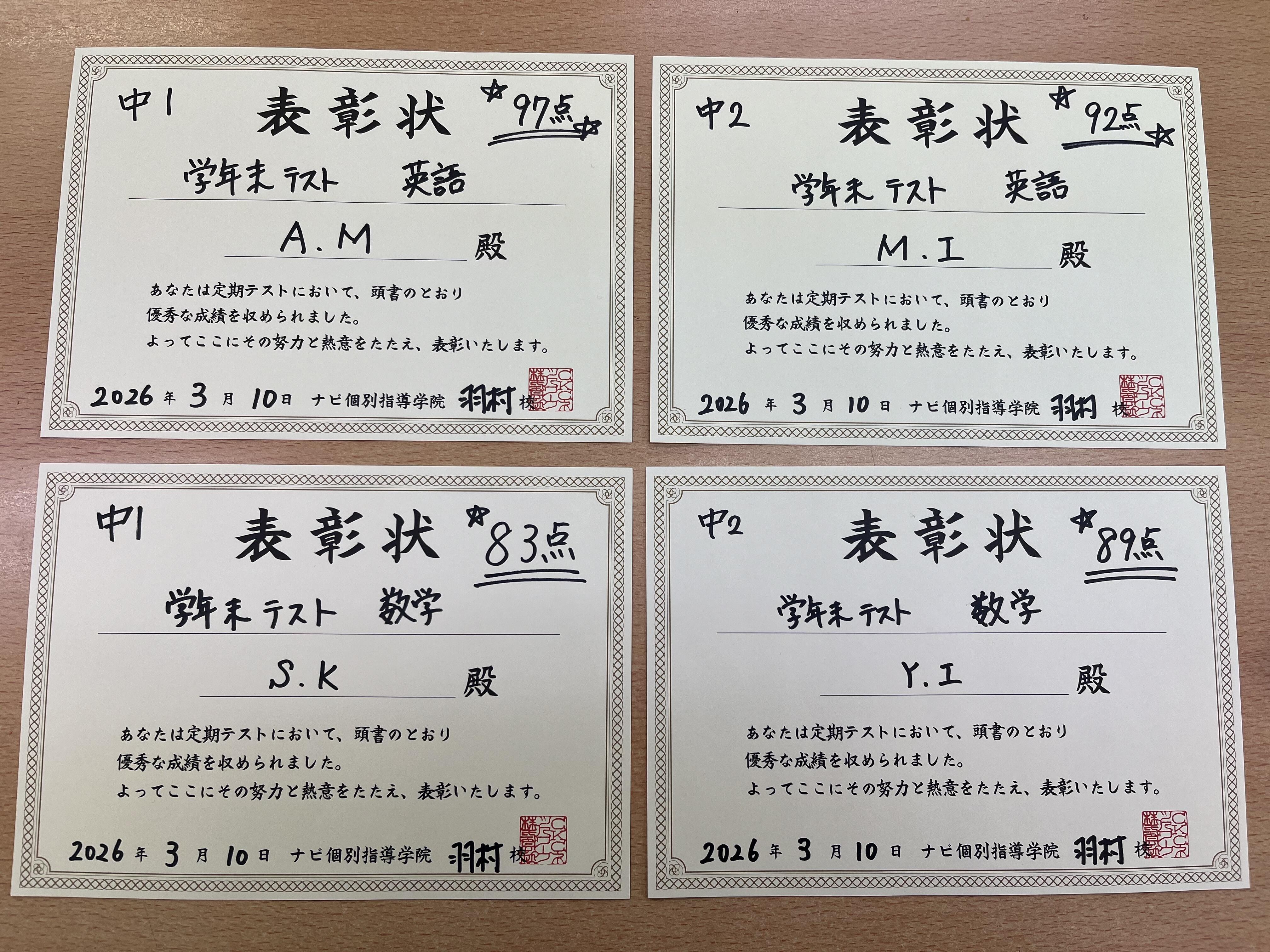本日は3学期 学年末テストの成績優秀者のご紹介をさせていただきます。