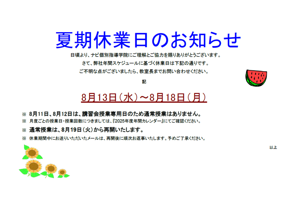 ※通常授業は8/19(火)から再開いたします。