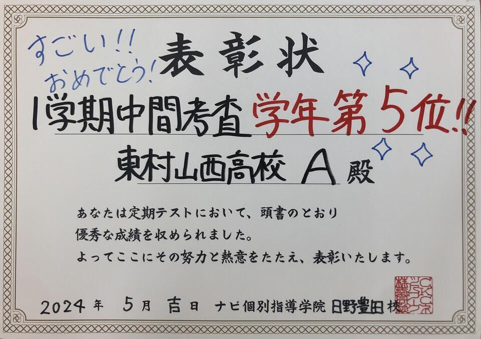 以前の成績優秀者で紹介した、東村山西高校のAさんの個票が返却され、