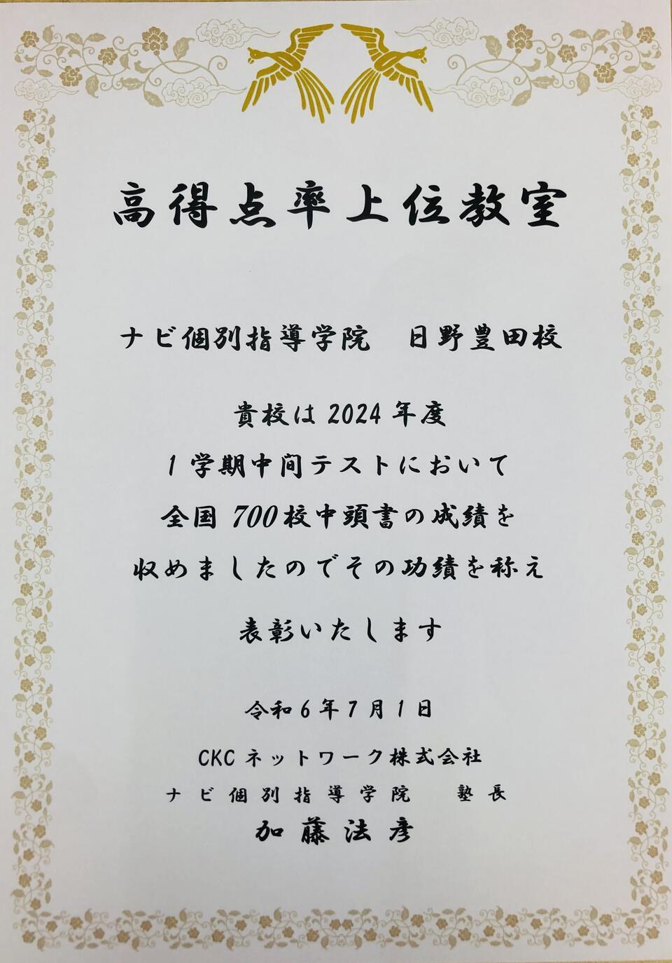 さて、本校日野豊田校が1学期中間テストの「高得点率上位教室」