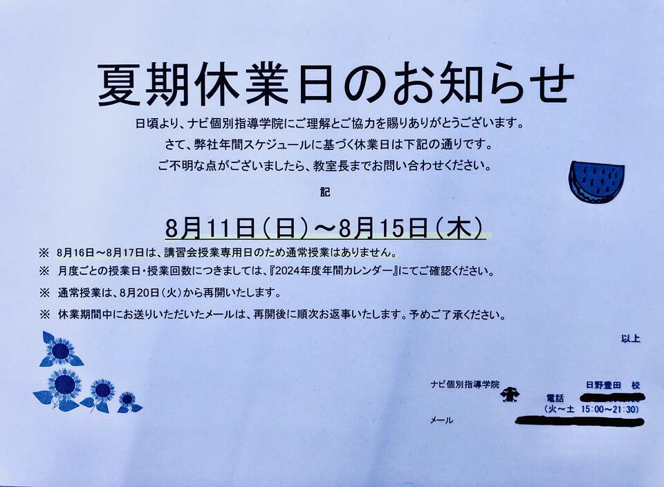 8/11(日)~8/15(木)までは「夏期休業」となっております。