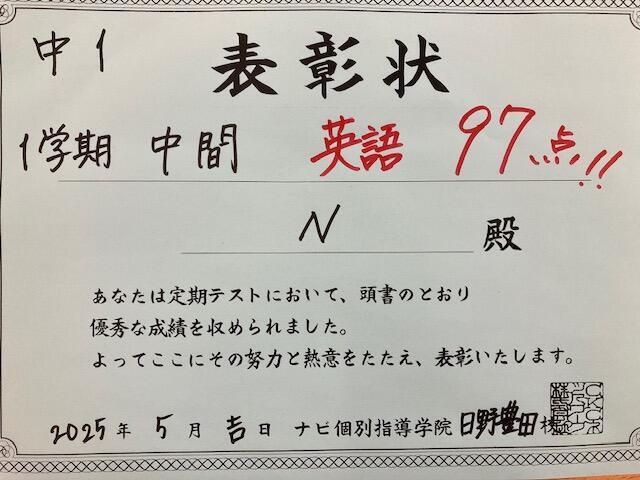 中学1年のNさんが、受講科目である英語で97点...!!!すごい!!