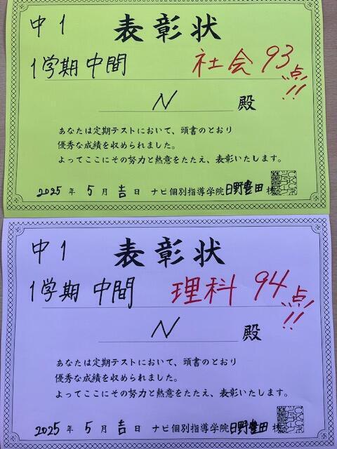 社会でも93点、理科でも94点と非常に良い中学校のスタートを切ることが出来ましたね☆☆