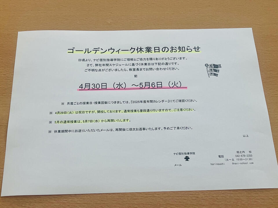 4/30(水)~5/6(火)の間はGW休業日となり教室が閉まっておりますので、