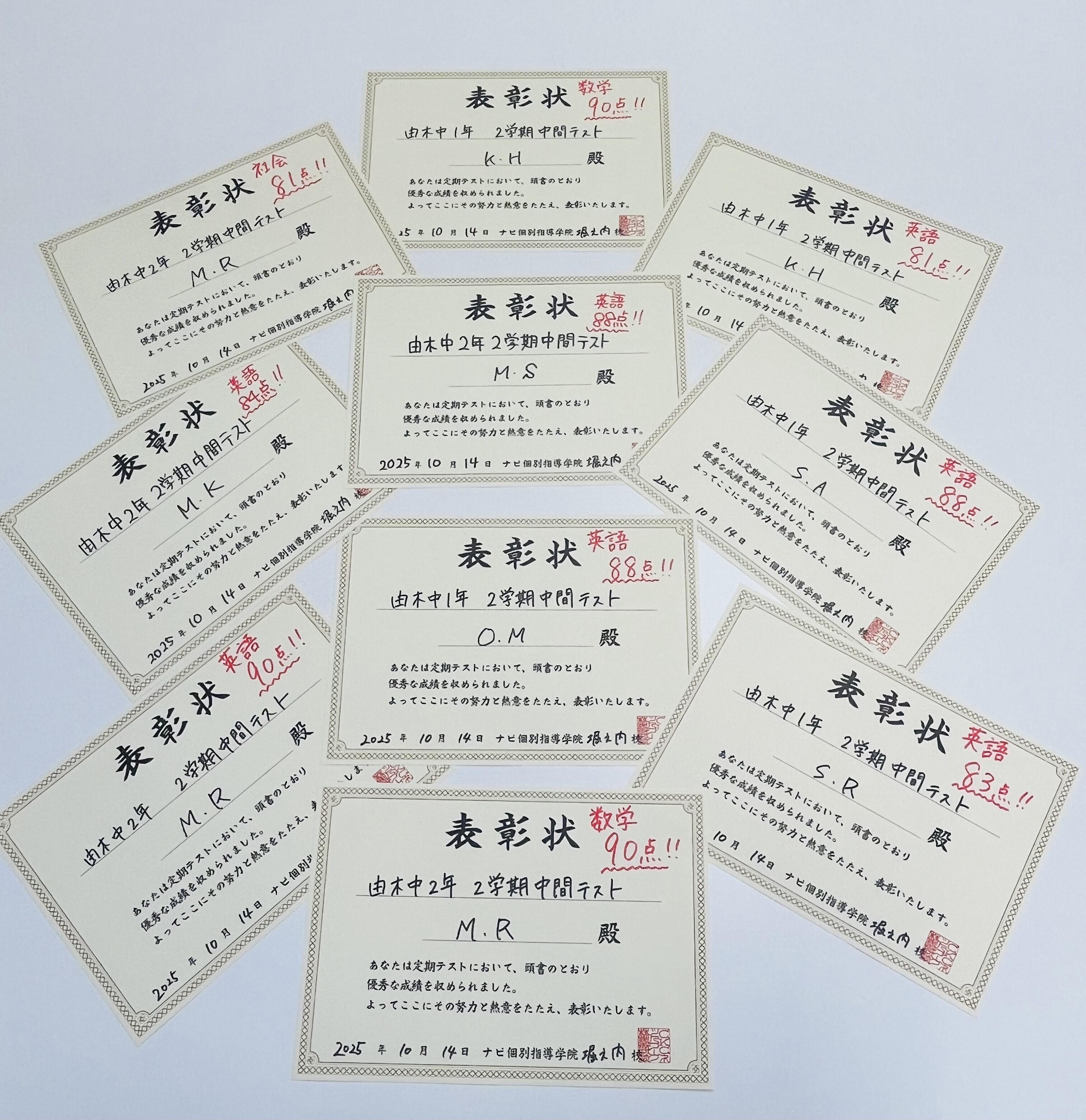 2学期中間テストで成績優秀者に表彰状を作成しました!!