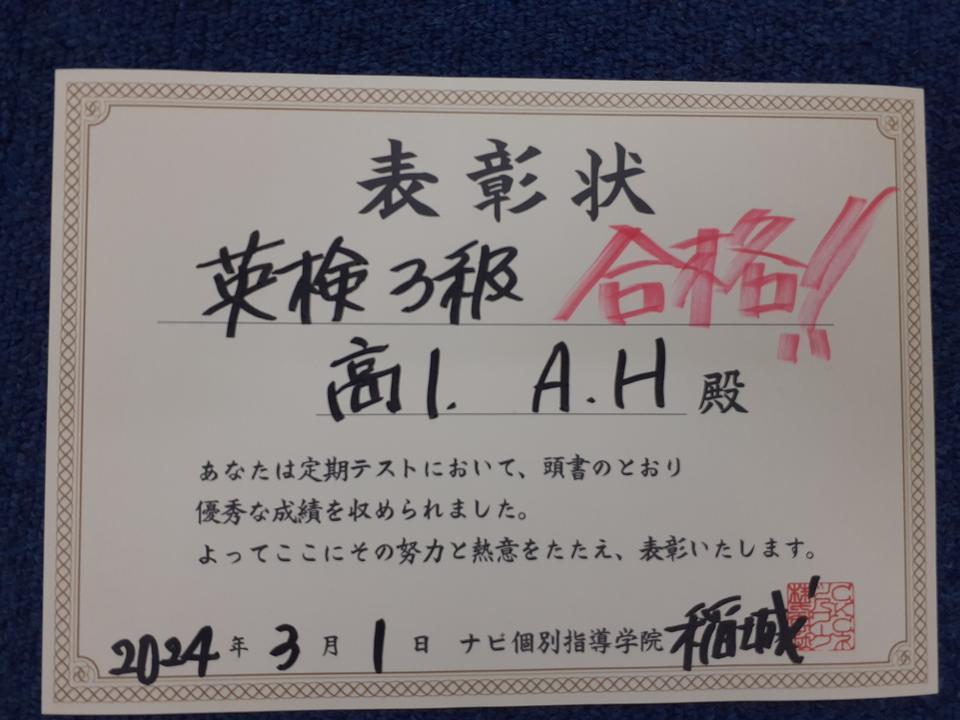 高校1年生のA.M君。英検3級合格おめでとう!!