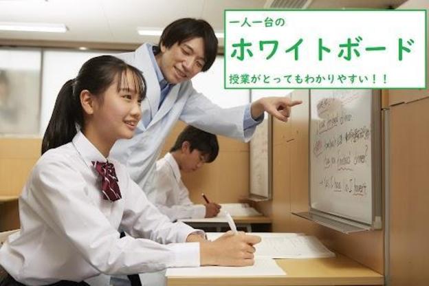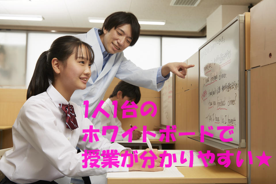 ナビ個別指導学院の授業は、個別の席ごとに設置された自分専用のホワイトボードで解き方や考え方を一緒に確認、それから生徒が問題を解くという「個別授業」スタイルです。