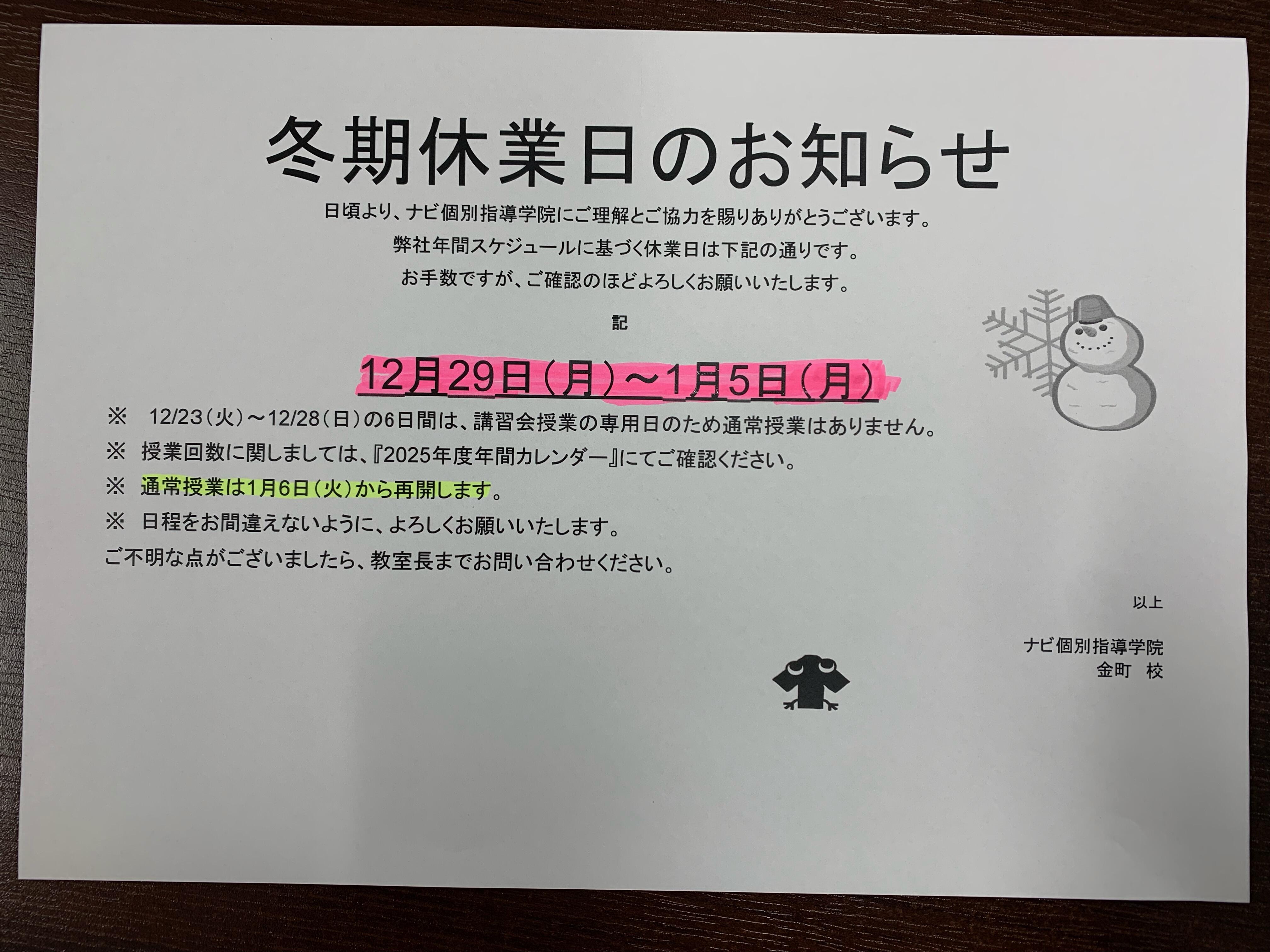 冬期休業日のお知らせ