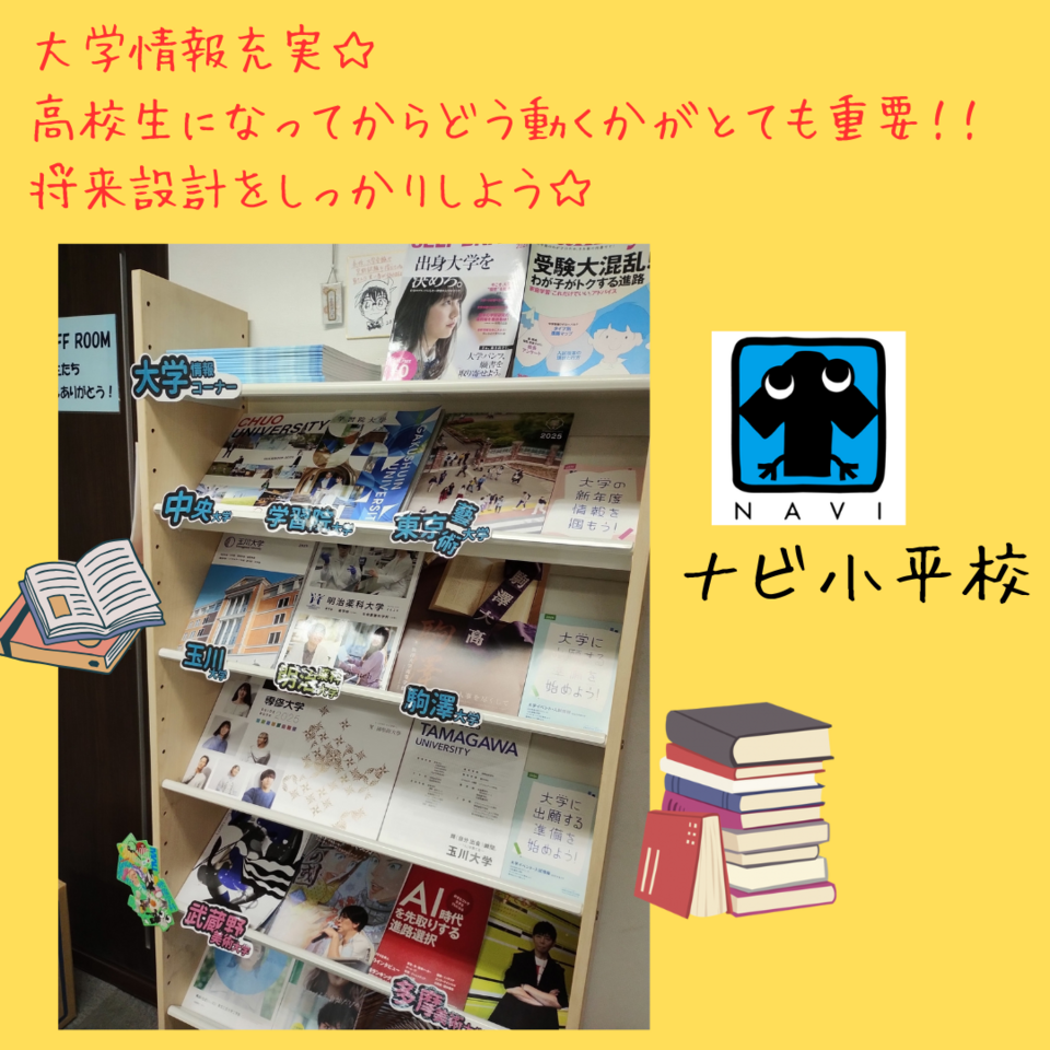 ナビ小平校は、大学情報も充実☆高校がゴールではなく、高校入学してからが「本番」です。そのためには、「目標設定」が重要となります。ナビ小平校では、高校情報はもちろん、大学情報も子供たちがいつでも見ることが出来ます。なりたい大人になるために。高校の勉強も一緒に頑張っていきましょうね。まずは、2学期期末テスト頑張っていきましょう☆