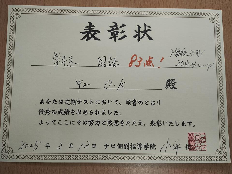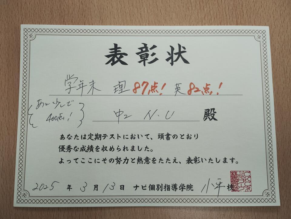 今回は学年末テストで好成績を出した生徒さんのご紹介です。