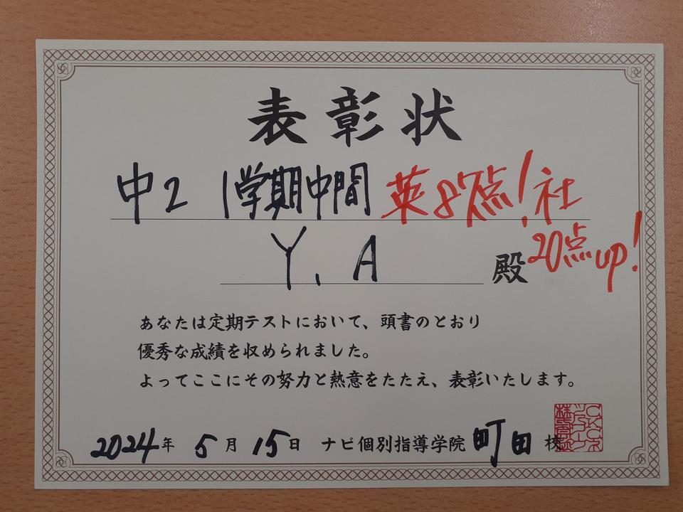 中学校2年生のY・Aさん。新学期が始まってから1か月も経たないうちの中間テストでしたがよく頑張りましたね!!