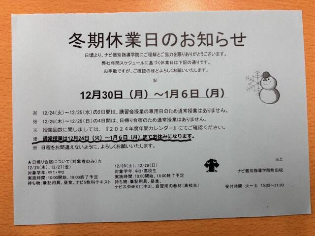 12/24(火)~12/28(土)の5日間は通常授業はお休みさせて頂き、