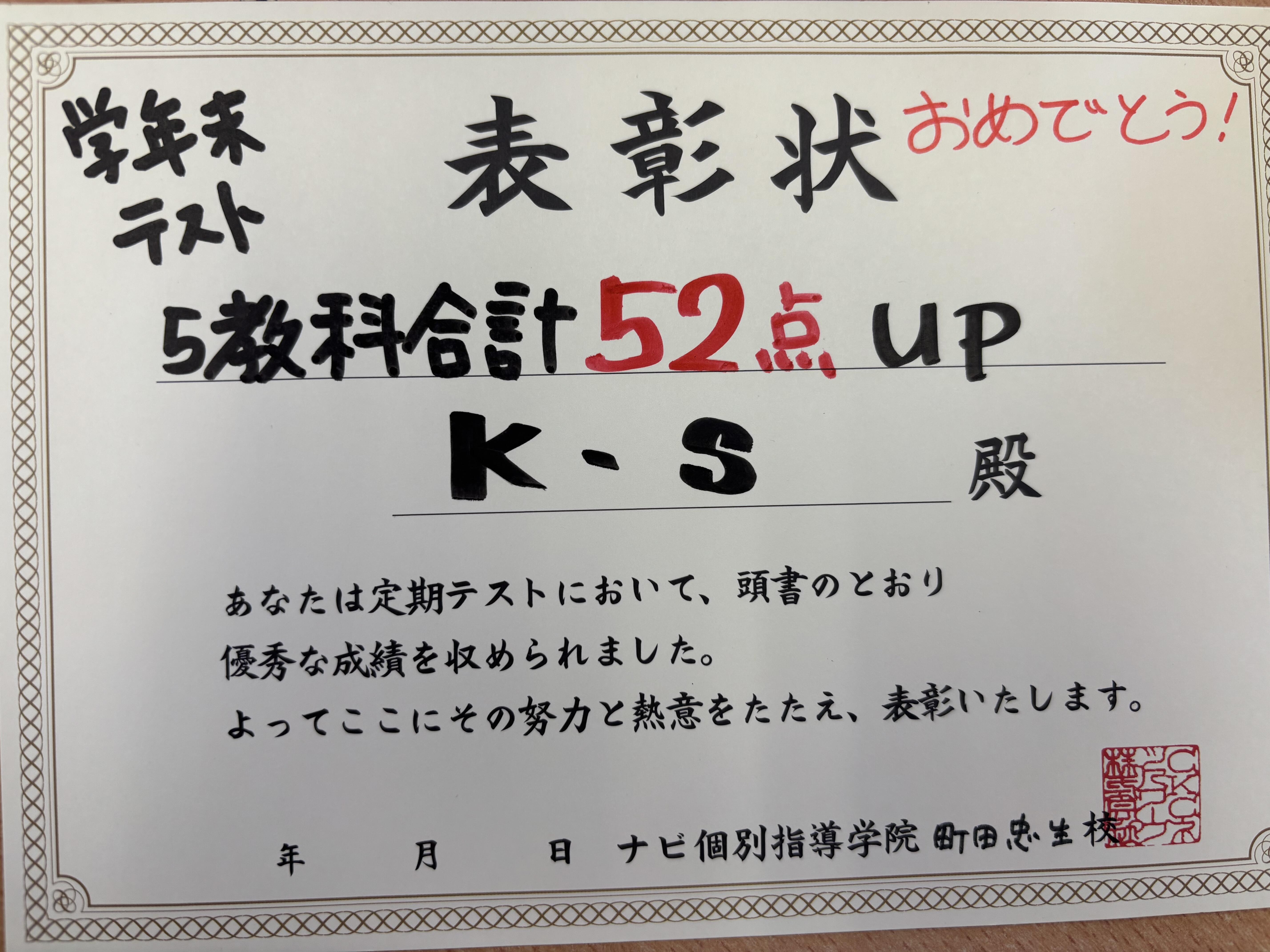 2学期期末テストから比べて52点上がった中学2年生の生徒がいます。